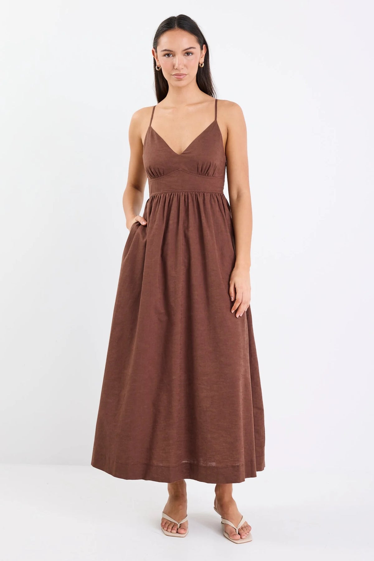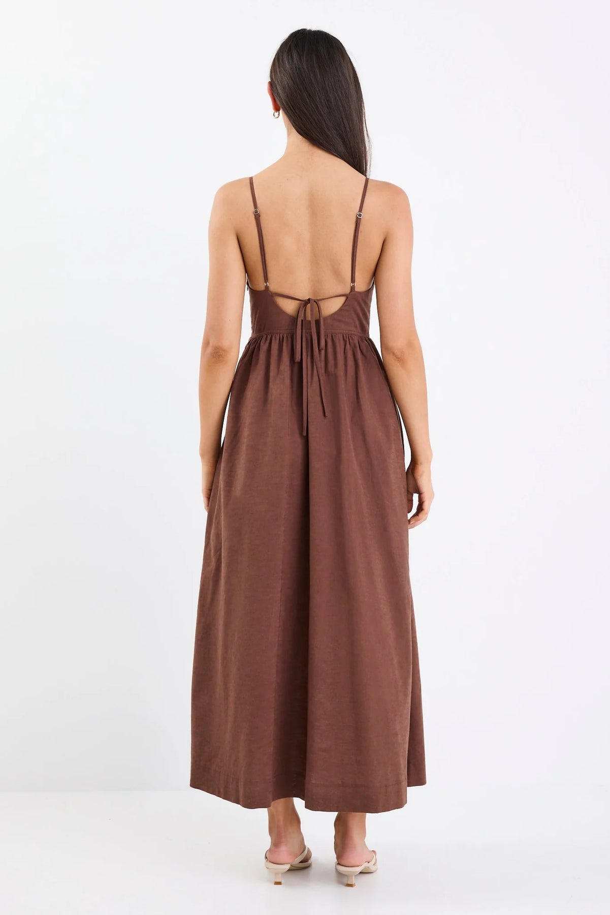 This dress offers a lightweight, breathable feel perfect for those sunny days. Featuring a delicate strappy design and a flattering midi length, it combines comfort and elegance with ease. The soft chocolate hue and natural fabric make this dress a versatile addition to your collection, whether you're enjoying a casual day out or dressing it up for evening affairs.